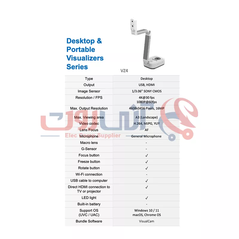 The VZ4 is a versatile 2-in-1 visualizer (document camera) featuring a 16-megapixel resolution and 4K streaming at 30fps. With its 20x digital zoom (achieved through software), this powerful tool captures every detail during presentations, whether you’re demonstrating books or other materials. Students can enjoy crystal-clear images, whether they are in class or learning remotely.